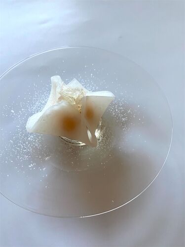 ・今日の和菓子「雪の華」 土佐文旦をいただいたので寒天寄せにして、柚子黄身あんと外郎に。いろんな柑橘がお口の中で弾け、冬の匂いのする和菓子。 このモデルは、妹と先日行ったサロンコンサート会場の電気のかさ。 これ、和菓子にしたら素敵だねぇと、妹…